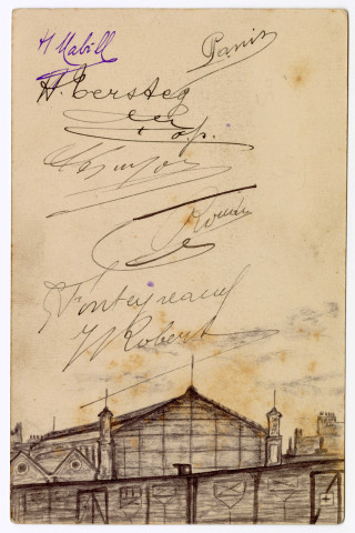 Au recto, il est écrit "Saint-Nazaire - Penhoët. Train sanitaire improvisé n°2 - 18ème section - Fonteyraud. Noël 1914" et le menu et les vins. Au verso, les participants au repas ont signé