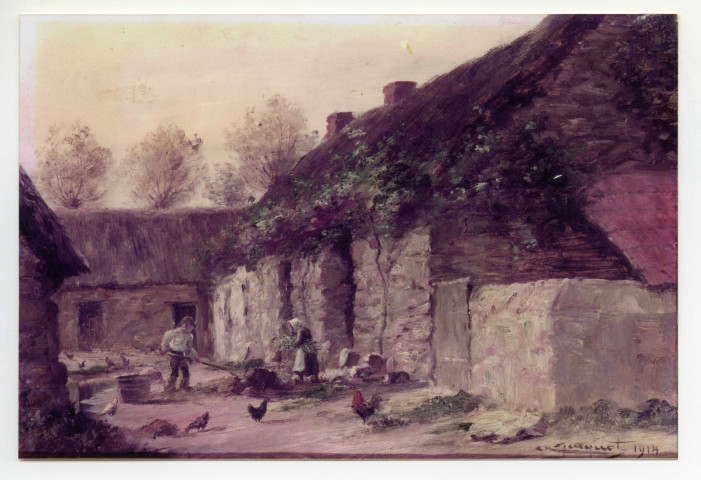 Photographie d'une peinture de Guerouet, représentant les bâtiments au toit de chaume et un couple s'activant auprès des animaux dans la cour.