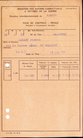 Les fiches comportent les informations suivantes : nom, prénom, date de naissance (quelquefois également lieu de naissance), adresse de l'ex-prisonnier, montant et date du versement du pécule. La plupart des fiches indiquent également la durée (en mois) de la captivité et le montant de chaque tranche du versement. On n'y trouve aucun renseignement concernant les lieux et dates de captivité.Le versement d'un pécule aux anciens prisonniers de la guerre de 1939-1945 fait suite à l'arrêté du 22 octobre 1952 "portant attribution d'un pécule aux anciens prisonniers de la guerre 1939-1945, pris en application de la loi n° 52-843 du 19 juillet 1952, relative à l'amélioration de la situation d'anciens combattants et victimes de guerre".
