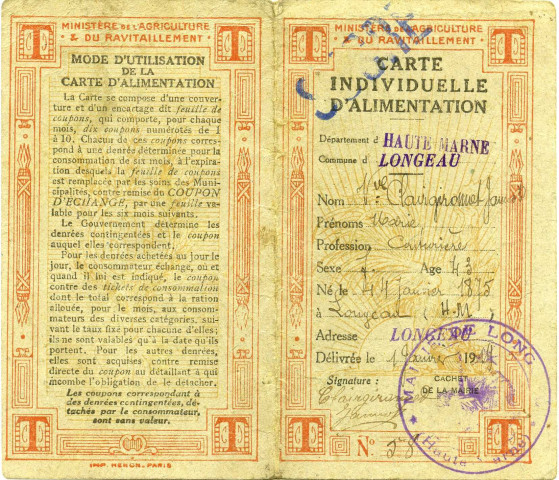 Carte individuelle d'alimentation pour la commune de Longeau (1917).