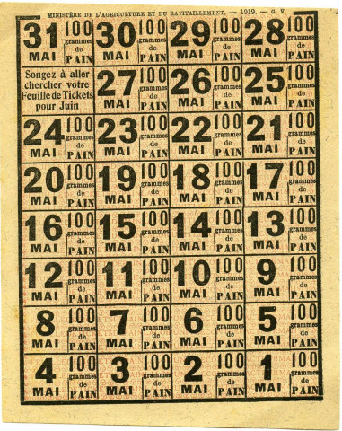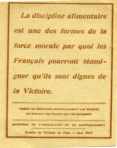 Feuille de tickets alimentaires pour le de pain (mai 1919). Au verso de la feuille de tickets se trouve un message de propagande du Ministère de l'Agriculture et du Ravitaillement sur la discipline alimentaire menant à la victoire de la France.