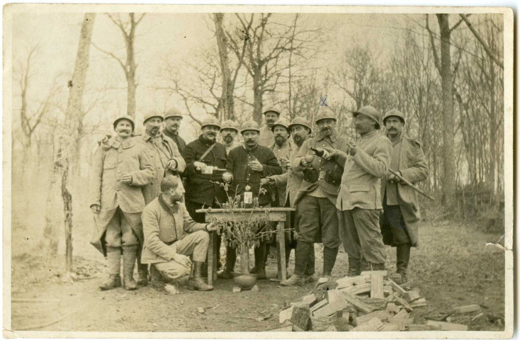 Vue sur un groupe de soldats dont Elie Cotté (3e soldat à gauche) devant une table installée dans une forêt ; devant la table un casque de soldat sert de vase : 1 photographie positive, noir et blanc.