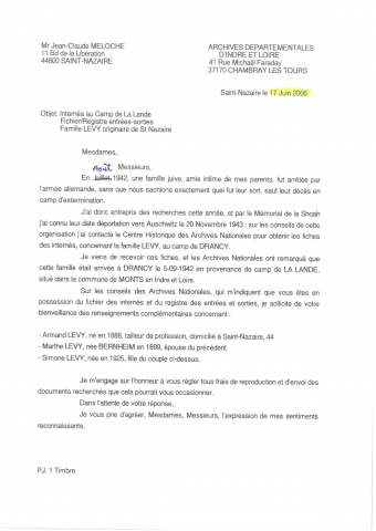 En 2005, Jean-Claude Méloche, né à Saint-Nazaire en 1932, entreprend une recherche qui le hante depuis plusieurs années, depuis cette soirée d'août 1942 où, alors qu'il est âgé de 10 ans, il assiste à l'arrestation de son amie Simone Lévy par la police militaire allemande. La jeune fille de 16 ans était venue passer quelques jours dans la demeure des Méloche à La Baule : elle est embarquée par les Allemands pour rejoindre ses parents, arrêtés quelques heures plus tôt dans leur domicile du 13, rue Villès Martin à Saint-Nazaire.