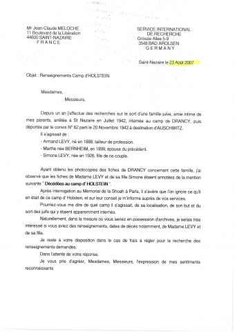 Demande de renseignements sur le camp d'Holstein auprès du Service International de Recherche de Bad Arolsen
